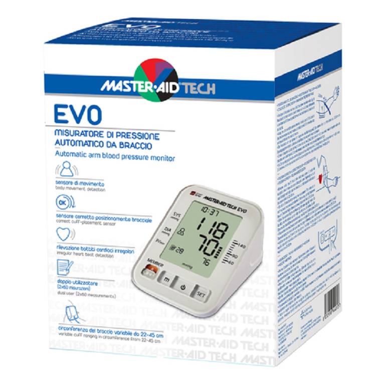 EVO è un misuratore di pressione automatico, facile da utilizzare e dotato di un display LCD ampio e facile da leggere. È dotato di un avanzato algoritmo in grado di interpretare i segnali pressori derivanti dal bracciale e determinare in modo affidabile i valori di pressione sistolica, diastolica e le pulsazioni.
